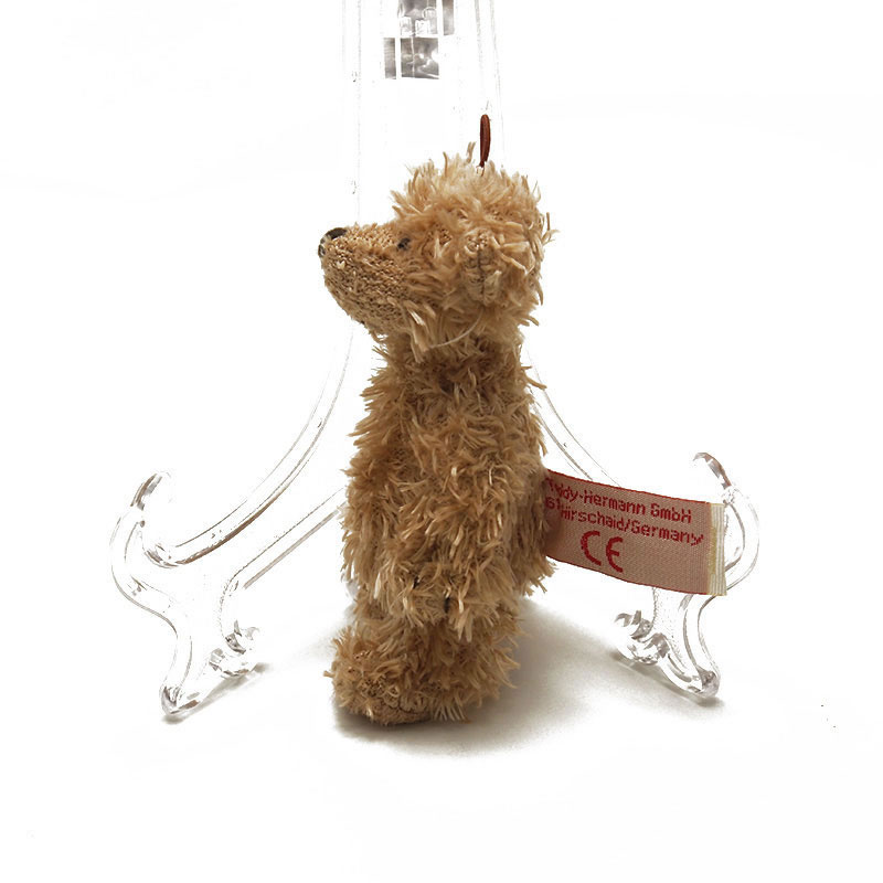 光沢のあるベージュの毛は柔らかい手触りです。鼻は手刺繍されています。グローブの形のような手足には爪の線が刺繍されています。腕と脚は少しだけ動かすことができます。(ジョイント式ではありません)頭にはゴムの輪があり、オーナメントとしても楽しめます。プリザーブドフラワーのミニバラを持っています。