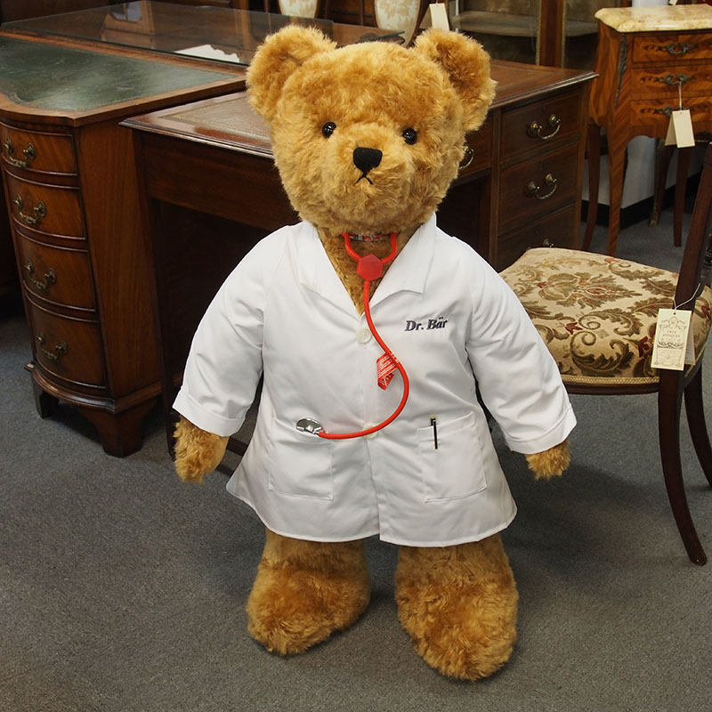 キャラメル色のカールしたモヘヤが美しいテディ先生は、白衣と愛用の聴診器を持って、お仕事に励んでいます。