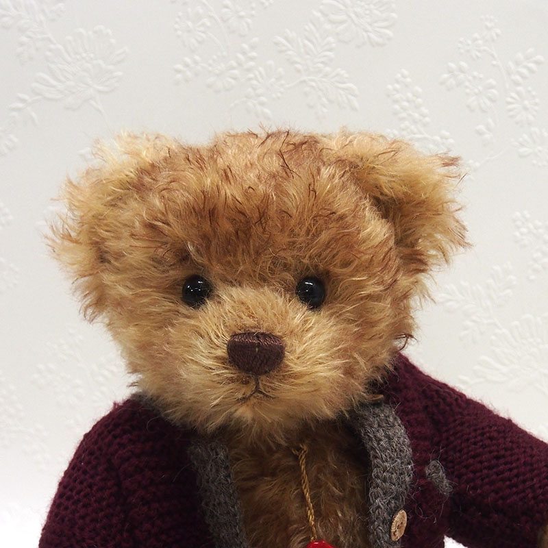 ゴールドのカールモヘヤは、所々毛先が茶色に染められており、テディの表情を豊かにしています。